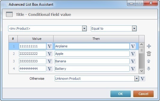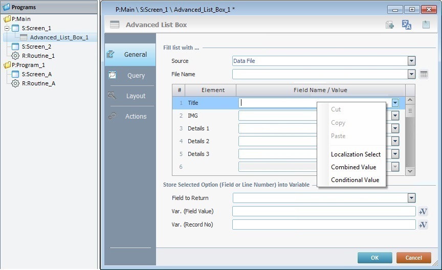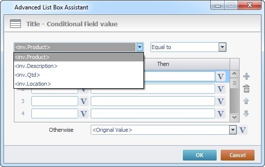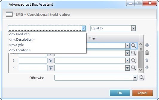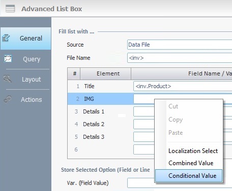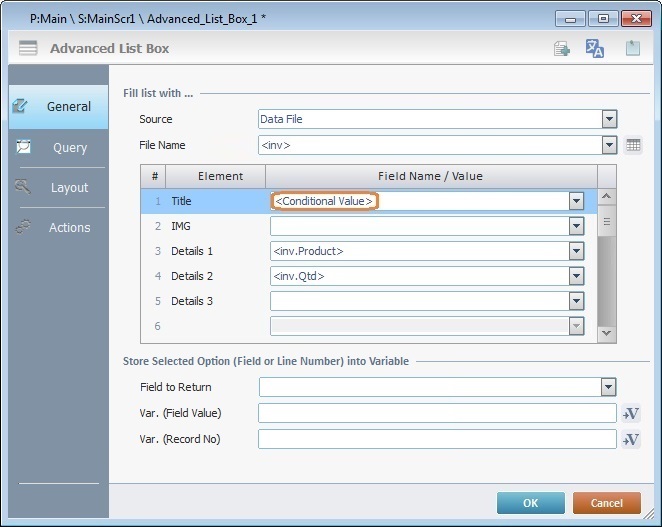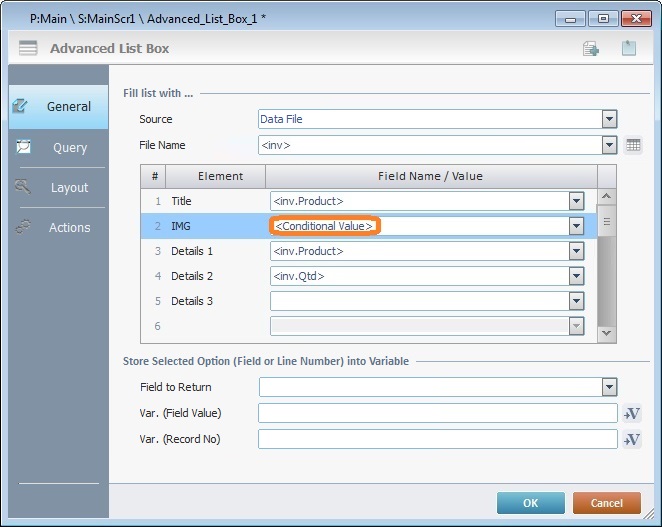 Conditional Value – Allows you to present data or images on the screen based on a condition. This condition is defined by the use of fields from a data file, a database table/view and fixed text.