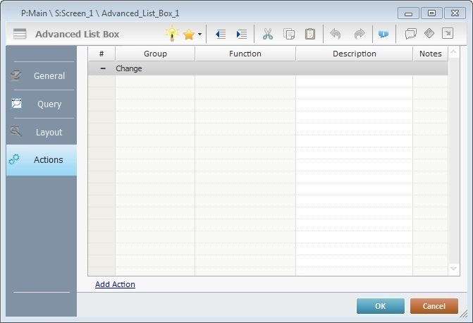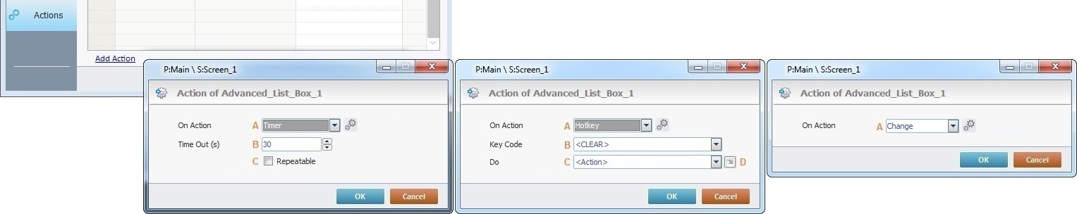 The Advanced List Box contains an exception, in terms of its default action. If the style of the Advanced List Box does NOT include button elements, the default action will be "Change" (triggered when the operator selects a record). If, however, you have created a style with a button element, the default action will be "Button #" (the incremented number depends on the button elements you have added) - it is triggered when the operator clicks the corresponding button. See Editing and Creating the Advanced List Box Style.
