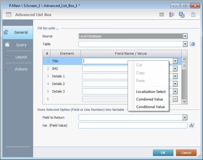 a. In the "Table" option, select the local database table from the drop-down. You can also insert a variable using the right-click menu and its "Variable Select" option. See How to Work with a Local Database. If needed, click