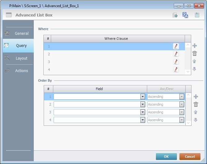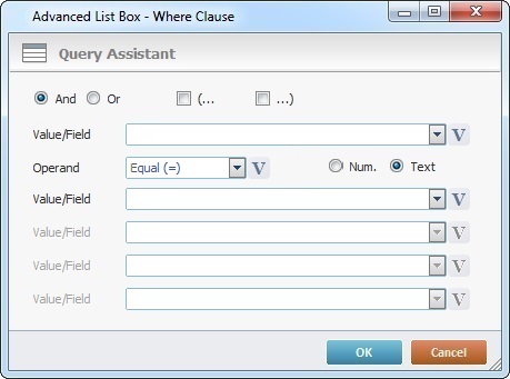 6. If required, define a query using "where conditions" in the "Where Clause" table. The "Query Assistant" will help you define the criteria for the necessary "Where" clause(s) (fields, operand, value type). Use the editing icons to the right of the table to move the rows up and down and to delete or add more rows.