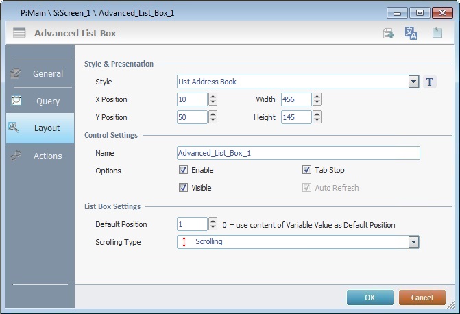 In the case of an Advanced List Box, the options available in the "General" tab depend on the control's style. If, at this point, you select another style, you must go back to the "General" tab and fill in the available options for the newly selected style.