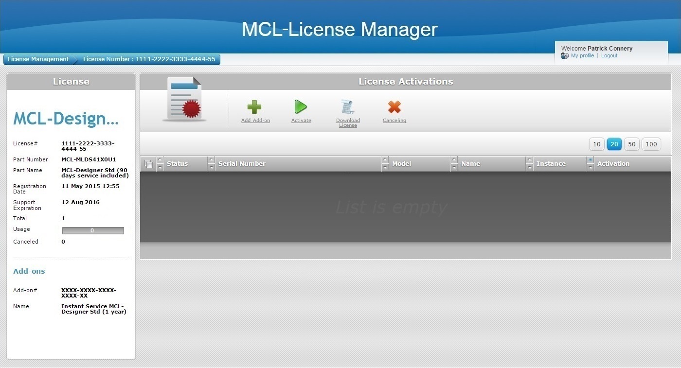 You can link an Add-on to a license that is registered in your MCL-License Manager account but has not been linked to a PC yet. The view of the inactive license's "License Activations" page is different. It only displays license/add-on related information in the left panel and the table, which is supposed to display information on the PC that has MCL-Designer installed, is empty. If you have associated your add-on to an inactive license, skip step 8 and proceed to step 9.