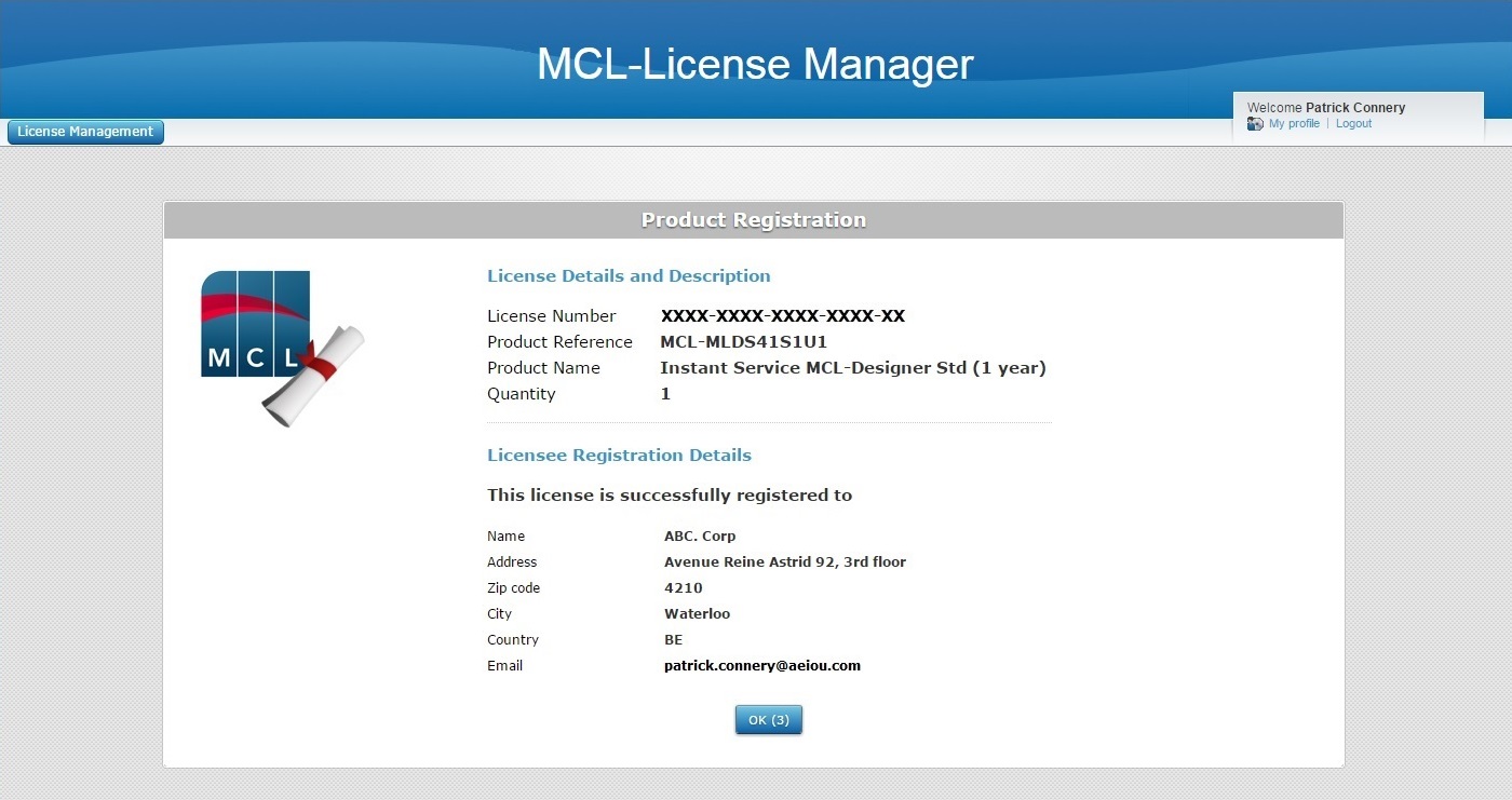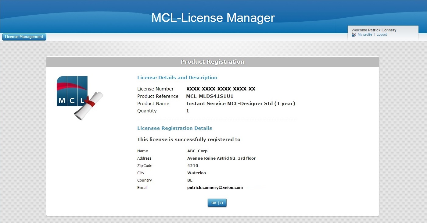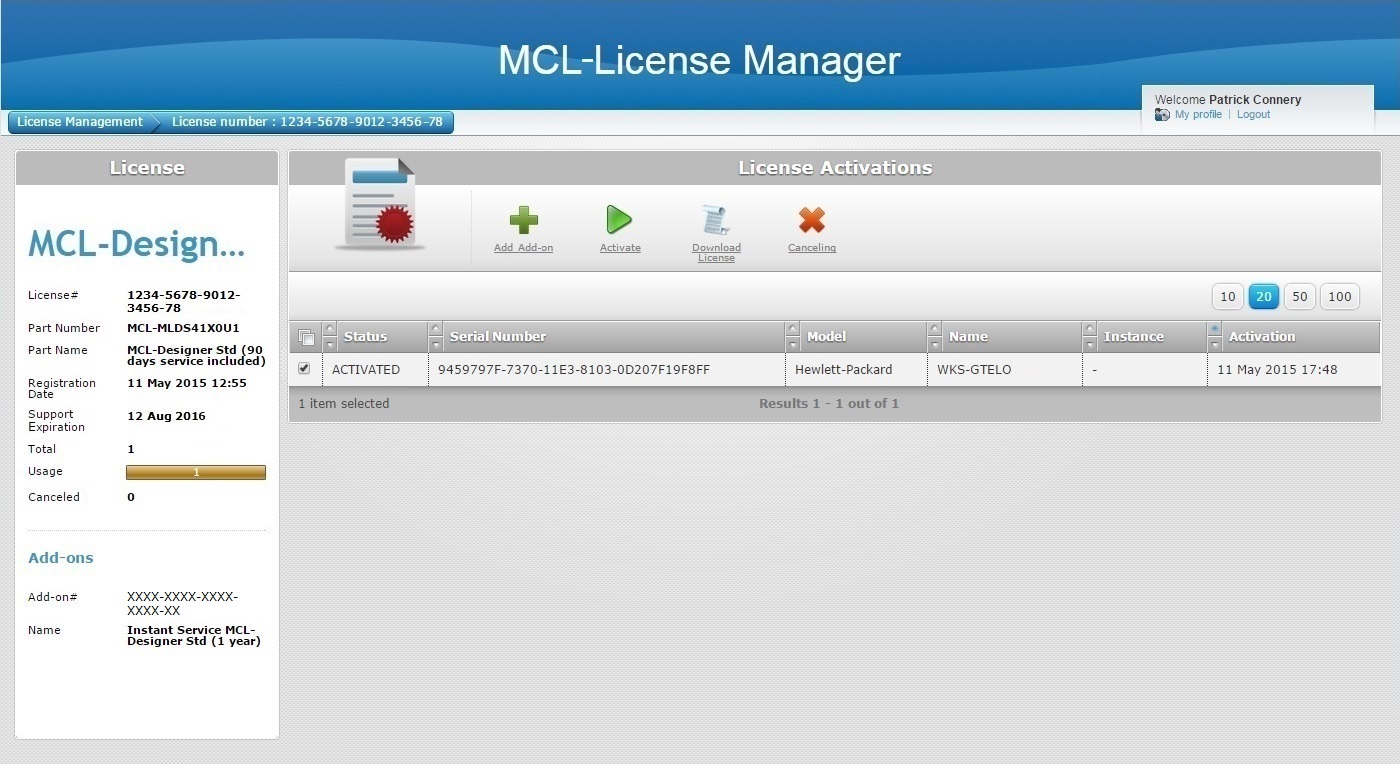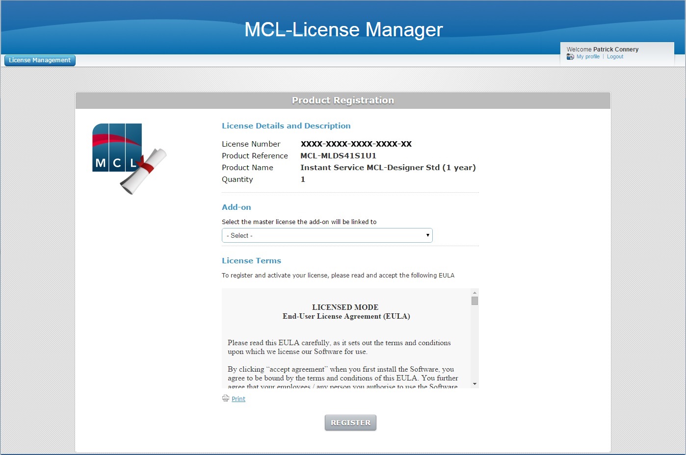 At this point, you receive an email ("subject: Add-on Activation") with the product name, product reference, add-on number and the master license number as well as a link ("License administration") to access your MCL-License Manager account.