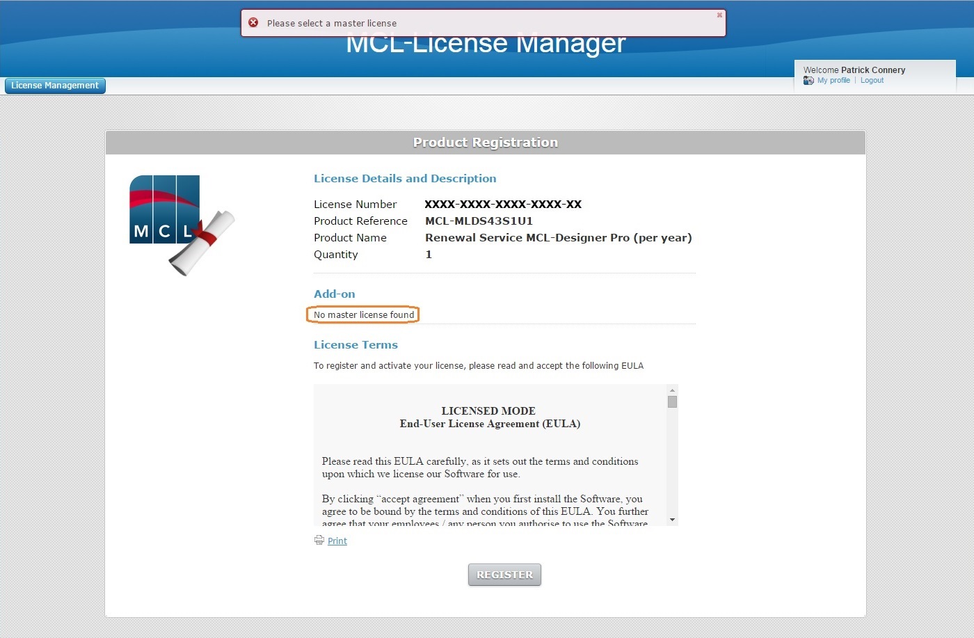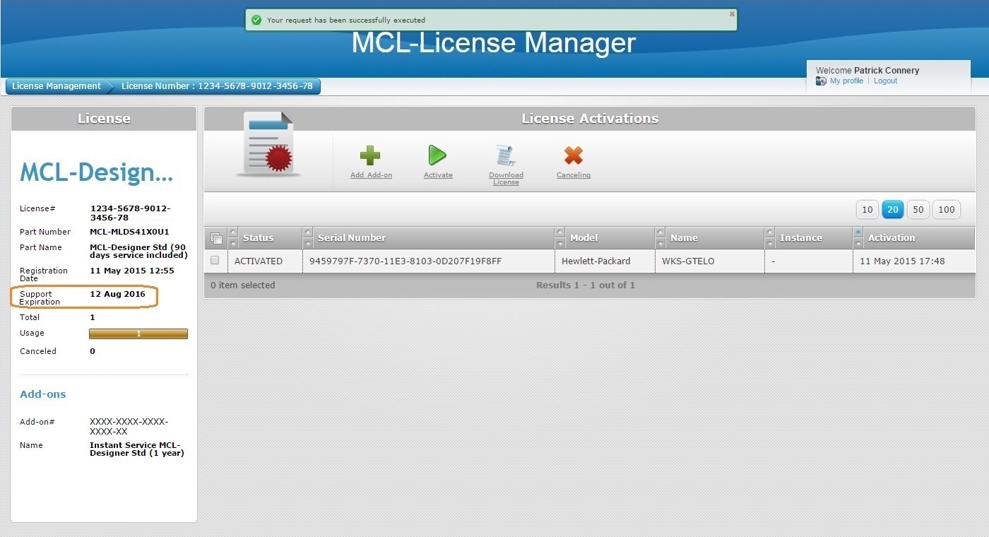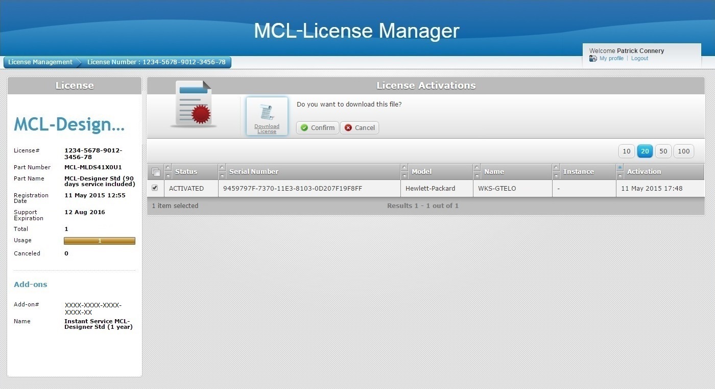 At this point, you receive an email ("subject: Add-on Activation") with the product name, product reference, add-on number and the master license number as well as a link ("License administration") to access your MCL-License Manager account.