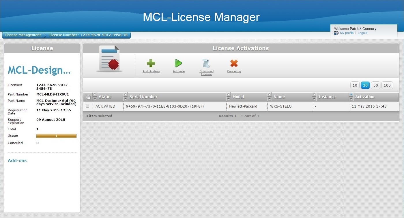 You can link an Add-on to a license that is registered in your MCL-License Manager account but has not been activated in a PC yet. The view of the inactive license's "License Activations" page is different. It only displays license/add-on related information in the left panel and the table, which is supposed to display information on the PC that has MCL-Designer installed, is empty. If you have associated your add-on to an inactive license, skip step 8 and proceed to step 9.
