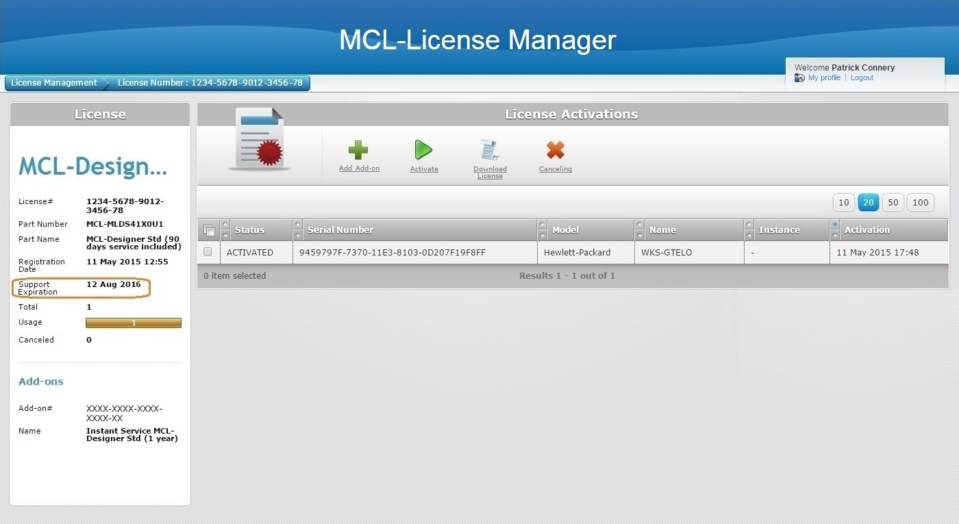 Ex: The add-on consisted of 1 year MCL Support. This time extension was added to the initial 90 days of MCL Support availability contained in the master license.
