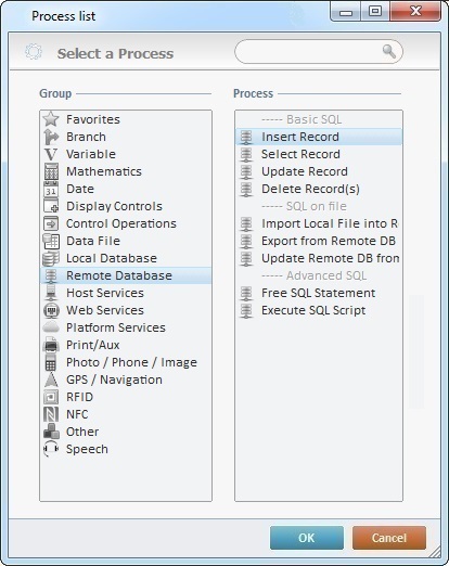 To Add a Process: The left section named "Group" displays the existing process groups. Select the intended one and the processes included in it are displayed in the right section of the window (named "Process"). Double click the process you want to add. This opens its properties window. Fill in the available options and click The selected process is added and appears in the control's "Actions" tab.