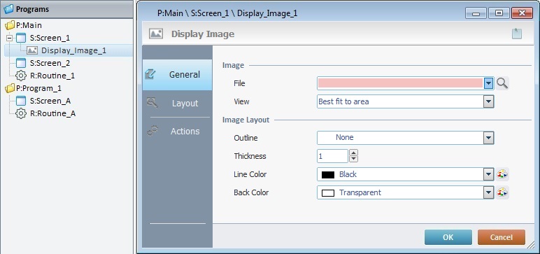 on to the screen. At this stage, there is still no image displayed, there is only an empty area within the screen. The Display Image control only displays an image after one is selected in its properties window (in the "General" tab, "File" option).
