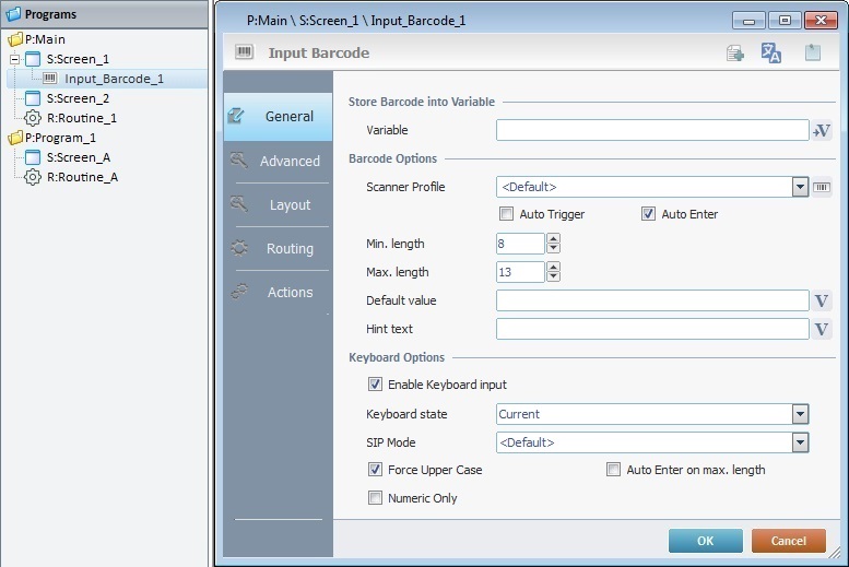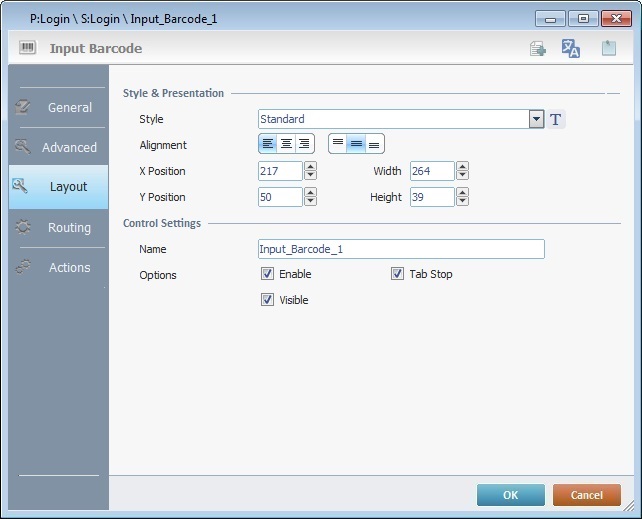 A barcode input box can be added to a screen by dragging an Input Barcode control