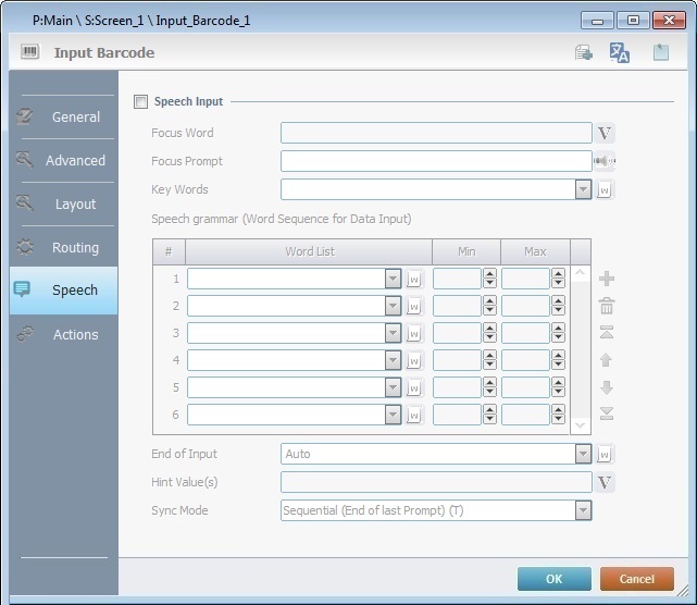 All speech related options within this control are explained in another topic - see Speech in the Input Barcode Control. Once you have gone through the topic, use the provided link to return to this step-by-step and continue to the "Actions" tab (step 29).