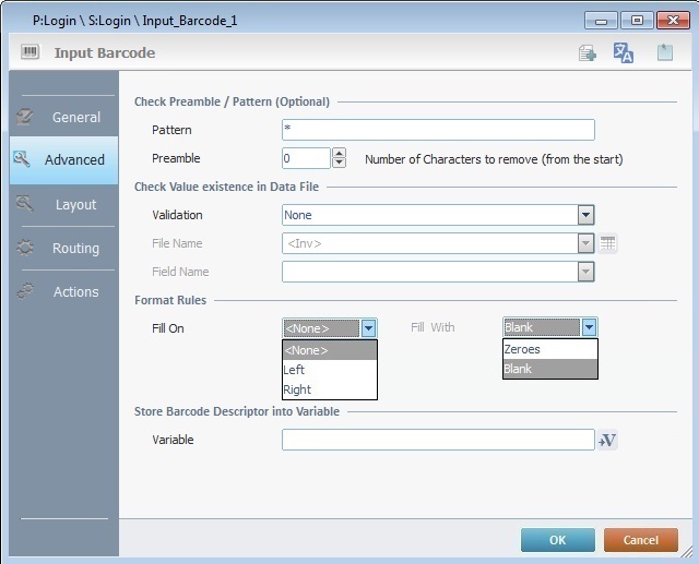 3. In the "Variable" option, define the variable that will store the barcode data by clicking
