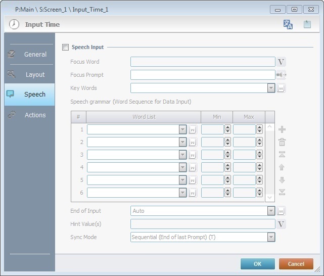 All speech related options within this control are explained in another topic - see Speech in the Input Time Control. Once you have gone through the topic, use the provided link to return to this step-by-step and continue to the "Actions" tab (step 14).