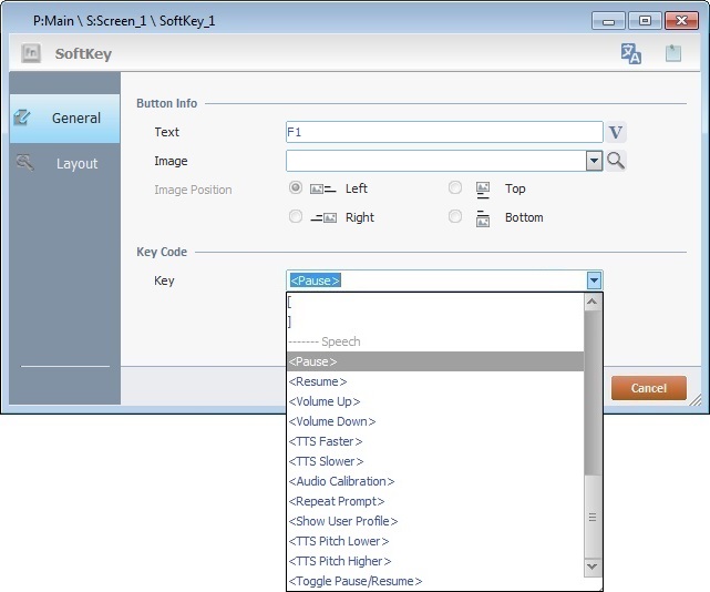 If the project includes speech attributes, it will also be possible to associate a speech related command to the SoftKey control ("Volume Up>"; "TTS Slower>"; "Audio Calibration>"; etc.).