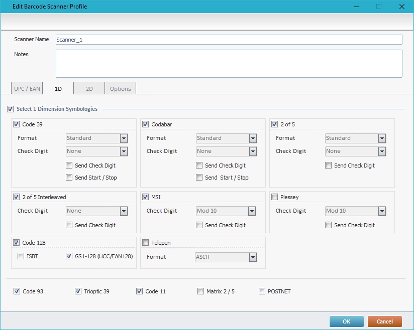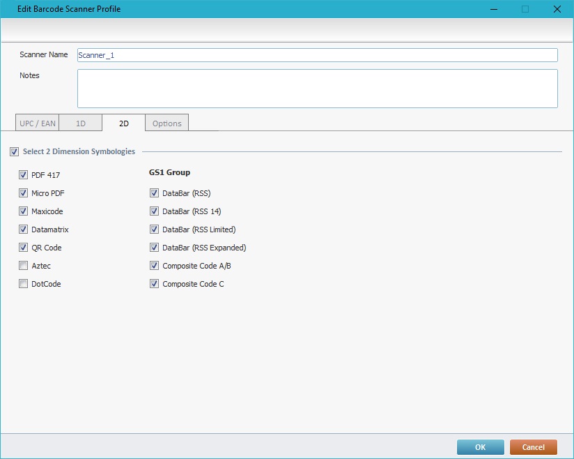 5. Construct a profile by going to each tab ("UPC/EAN"; "1D"; "2D", "Options") and selecting the required options.