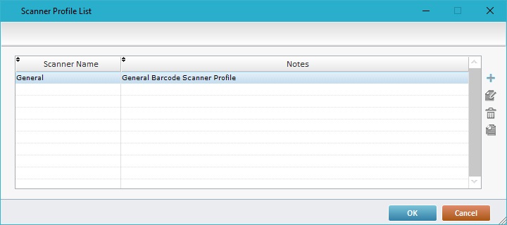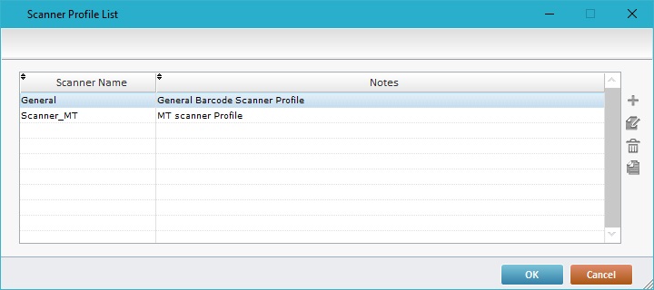 •The default scanner profile, "General", includes generic scanner settings and is editable. •Use the icons located to the right of the table to, respectively, add, delete, edit and/copy barcode scanner profiles. To have more details on creating/editing a barcode scanner profile, see To Create a Barcode Scanner Profile below and To Edit a Barcode Scanner Profile.