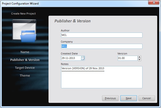 •Type a name for the project in the “Project Name” box. The "Application Name" box below fills in automatically with the text entered in the previous box ("Project Name"). The "Application Name" represents the application in the screen of the device (in App Desktop) and can also be viewed within MCL-Designer.