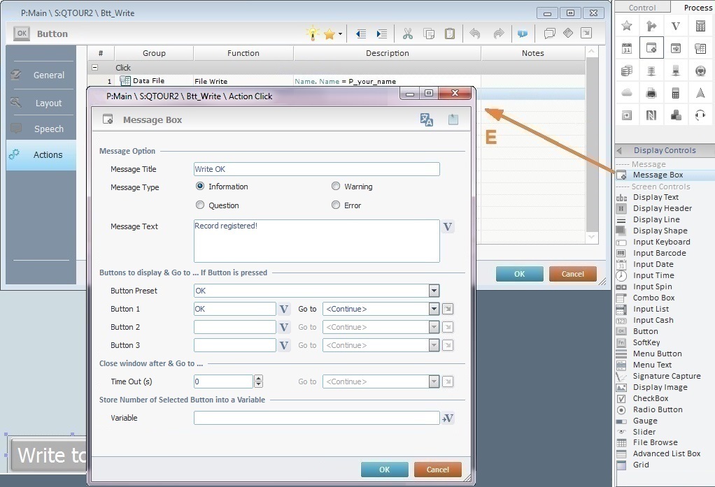 The "Message Box" process was chosen to present a dialog box to emphasize the "Write Records" process.