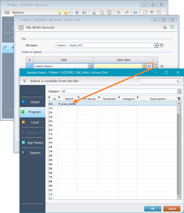 to open a "Standard Variable Select" window and create a "Program" variable that will receive data. See Working with the Variable Processes Group.