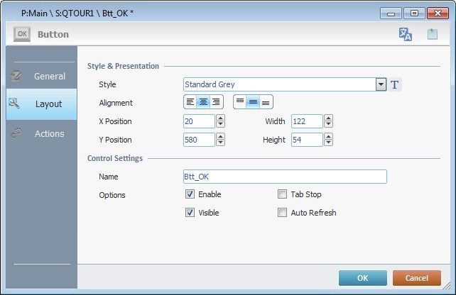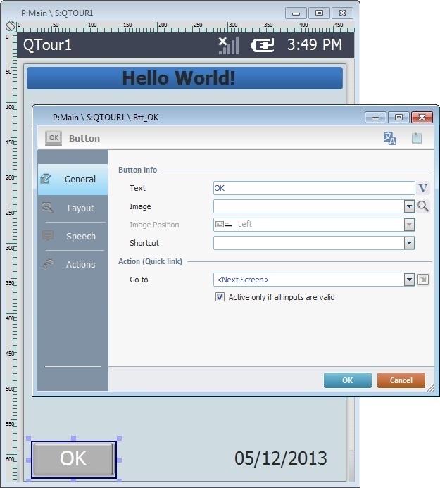 Ex: To display the desired text on the Button control, enter "OK" in the “Text” box and select the "Next Screen" in the "Go To" box, as shown in the illustration below: