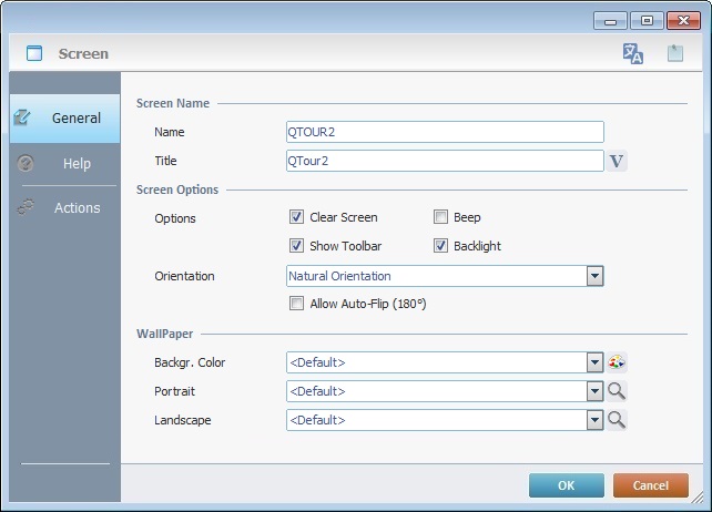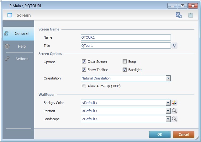 Ex: Replace the default screen name - "Screen 1" - for "QTOUR1" and maintain the default options as displayed below.