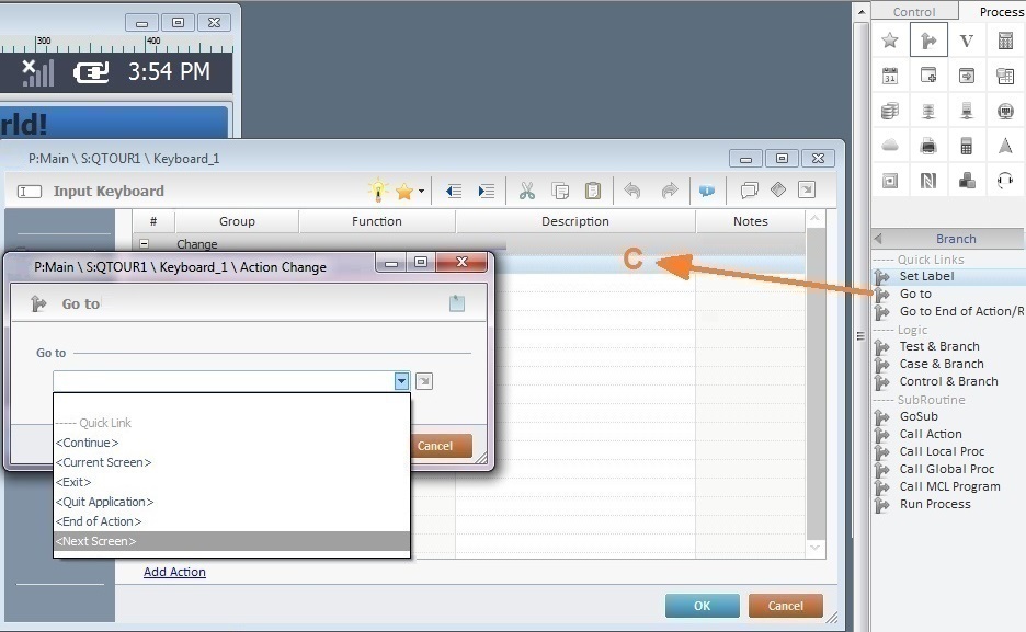 . Select the "Go to" process from the "Process" tab's lower section and drag it onto the first available row of the "Actions" tab (C).