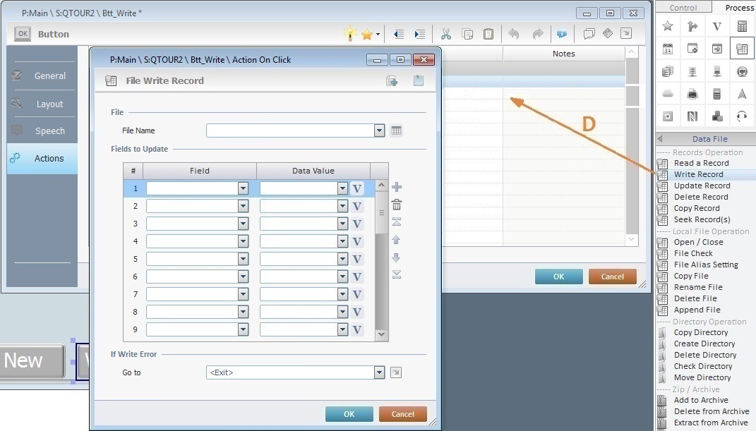 Select the "Write Record" process from the "Process" tab's lower section and drag it onto the first available row in the "Actions" tab (D). This opens a "File Write" window.