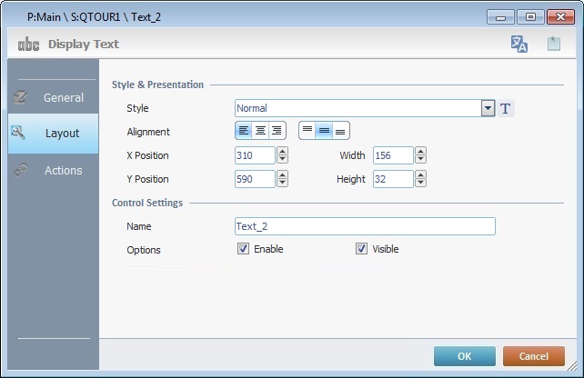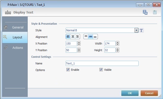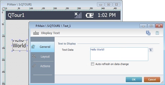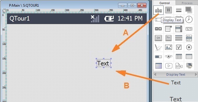 Ex: Click the “Display Text” control and drag-and-drop it on the "QTOUR1" screen."