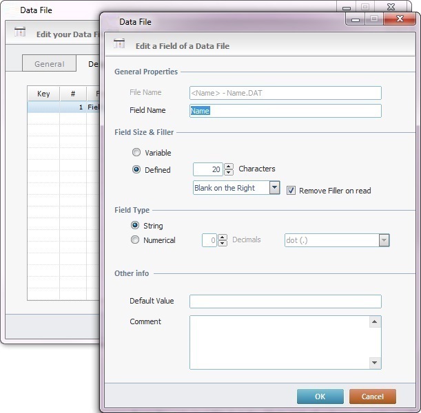 50. Back in the process's properties window, select the file that has just been created. The "Field" column will automatically display all the field names from the selected file but the "Data Value" column must be configured by clicking