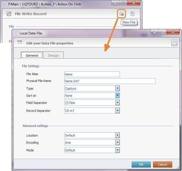 46. In the "Write Record's" properties window, create a file to receive the data input.
