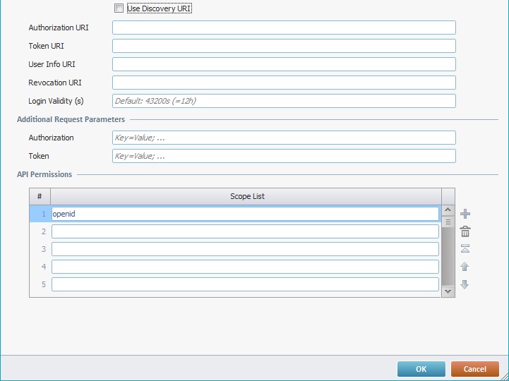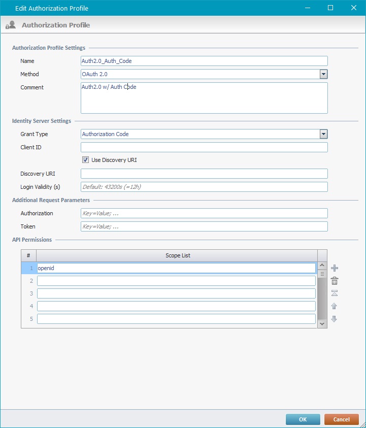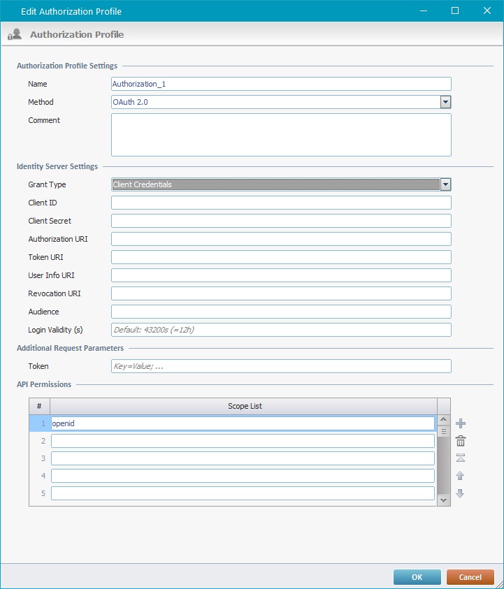 4. If required, define additional custom parameters in the "Additional Request Parameters" section. This way, if these are required values, it is not necessary to insert them every time the application requests communication with a web service via the current authorization profile.