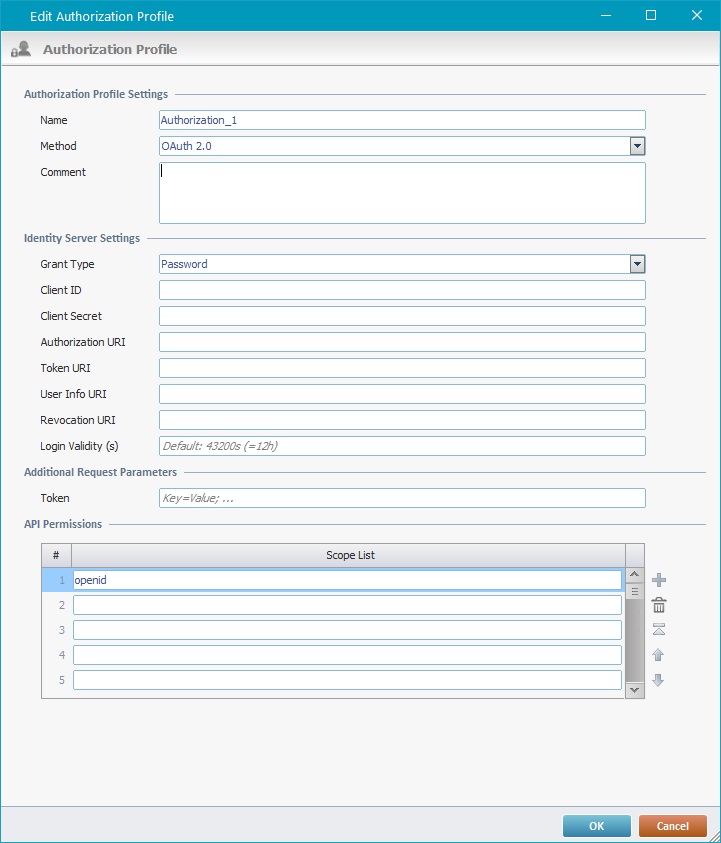 Proceed as follows to create an authorization profile with an OAuth 2.0 authentication - OAuth 2.0 is the recommended authorization protocol and used as an industry-standard. It uses an identity server that is contacted by the MCL application to verify if the user is authorized to communicate with the intended web service. The MCL application does NOT have access to actual user information (grant type "Authorization Code"), it only receives a confirmation of access authorization and uses it to contact the web service.
