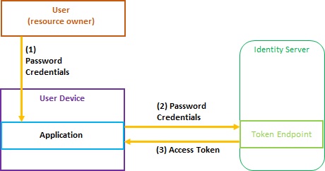 2. The application forwards the password credentials to the Identity Server. Those are analyzed and the access token is returned to the application – (2);(3)
