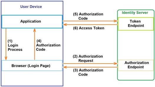 Authorization Code - This grant type takes advantage of the device browser (external to the application) to negotiate an authorization code with the Identity Server. This very secure method avoids the application to be aware of the user credentials (handled exclusively in the browser). Once the application has access to the authorization code, it can request a token so it can, then, call the resource server APIs.