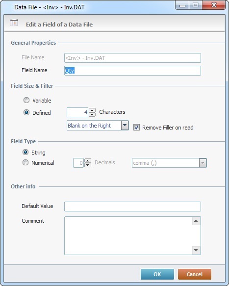 Check or uncheck the option to define field size. If checked, specify the number of characters and fillers allowed in the field. Check/uncheck "Remove Filler on read". |