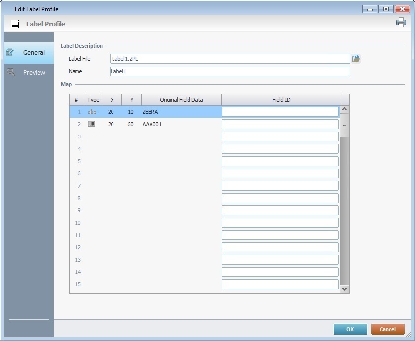 Each "Field ID" information is used by the "Print Label" process to help map each original label field for printing. |