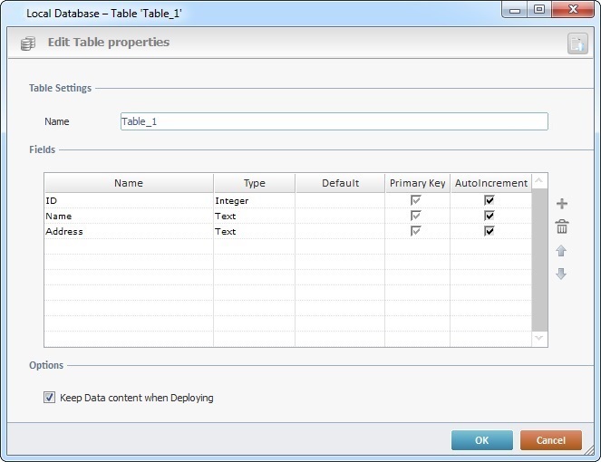 Maintain or check/uncheck the option regarding table content. Checking this option ensures that the data contained in the current table, and not just its structure, will be delivered with the project, if you upload it onto a device, use MCL-Simulator or MCL-Tracer to test/analyze the project. |