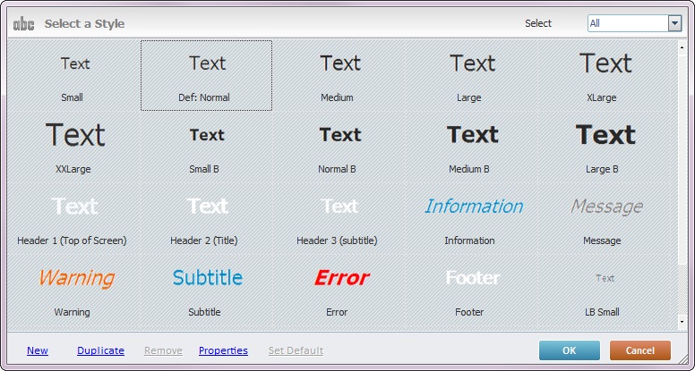 It is possible to filter the displayed styles. Select one of the following options from the drop-down: All – Displays all the styles available. Internal – Displays MCL-Designer V4's standard styles. Custom – Displays the styles you have created. |