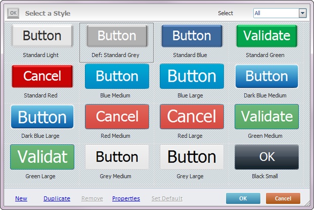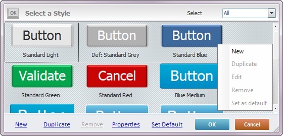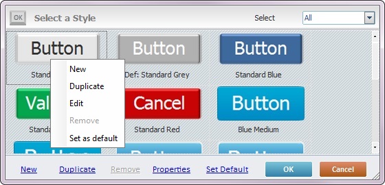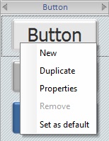 Sets the selected style as the default style ("Def:" is added to the style's designation). Once set, the default style will be adopted by all Button controls dragged from the “Control” tab onto the screen. |