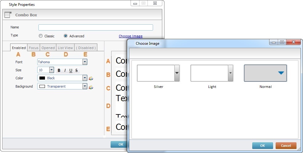 c. Edit each Combo Box state (“A- Enabled”; “B-Focus”; “C-List View”; “D-Disabled" and "E-Invalid”) after clicking each tab: