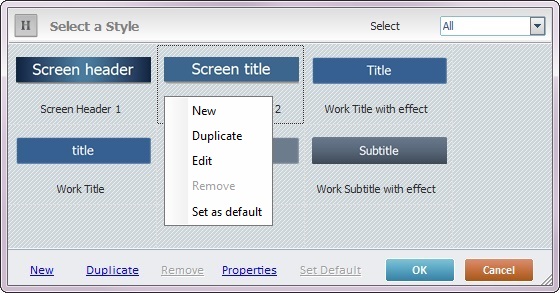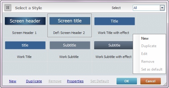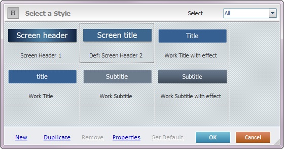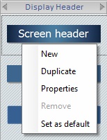 Sets the selected style as the default style ("Def:" is added to the style's designation). Once set, the default style will be adopted by all Display Header controls dragged from the “Control” tab onto the screen. |
