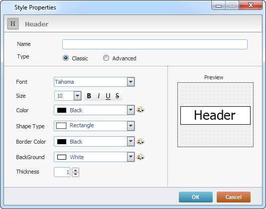 Whichever the option used (A or B), the creation of a new style occurs in the "Style Properties" window. Take the following steps to fill in/adjust the available options in this window: