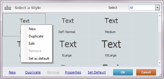 Sets the selected style as the default style ("Def:" is added to the style's designation). Once set, the default style will be adopted by all Display Text controls dragged from the “Control” tab onto the screen. |