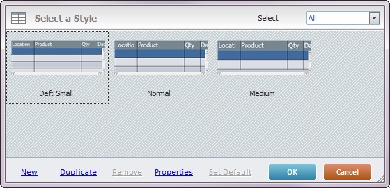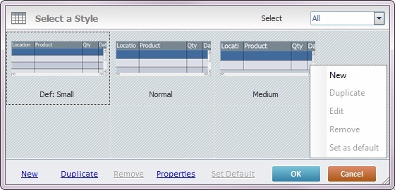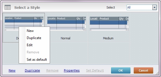 It is possible to filter the displayed styles. Select one of the following options from the drop-down: All – Displays all the styles available. Internal – Displays MCL-Designer V4's standard styles. Custom – Displays the styles you have created. |