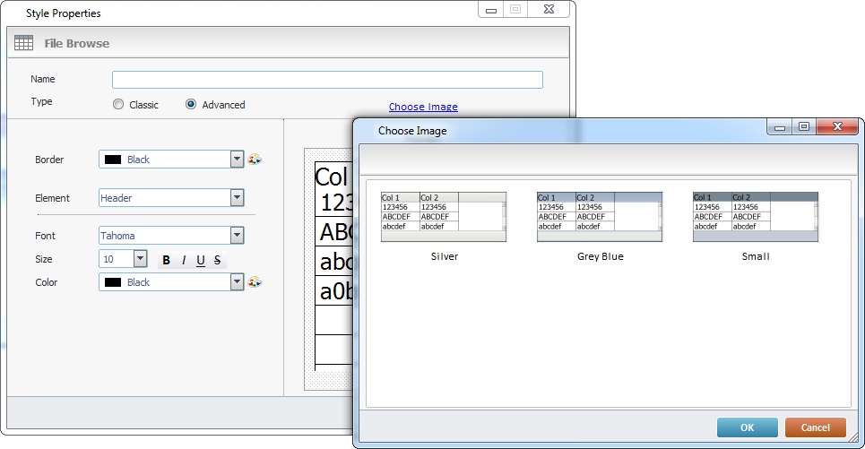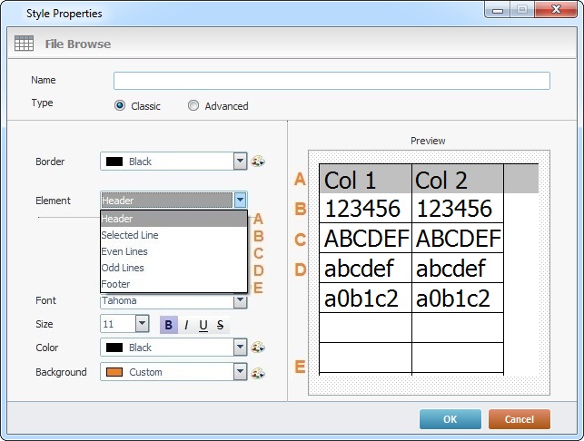 b. Select the element ("Header"; "Selected Line"; "Even Lines"; "Odd Lines" and "Footer") that will be edited in the following option boxes.