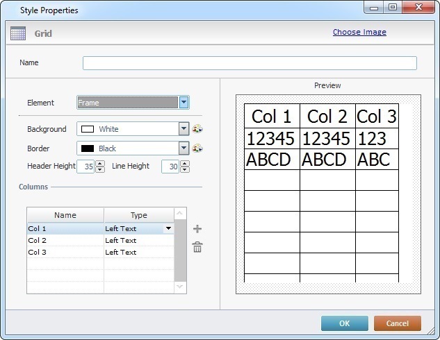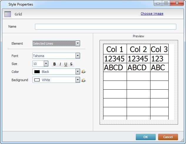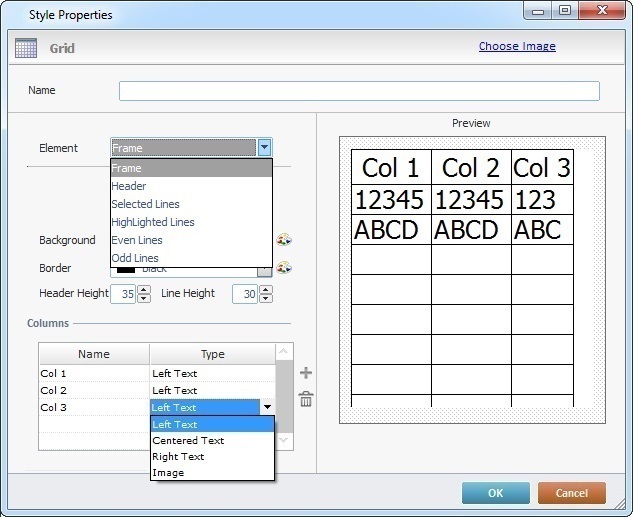 The "Element" drop-down displays the default "Frame" option but it is possible to control the "Header", "Selected Lines", "Highlighted Lines", "Even Lines" and "Odd Lines" elements. Depending on the selected element, you access the corresponding options.