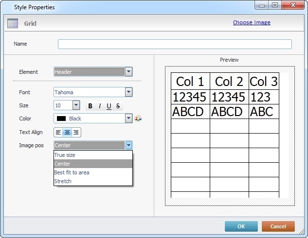 e. If, instead of text, the header displays an image, select its position in the "Image Pos" drop-down ("True Size", "Center", "Best fit to area" or "Stretch").