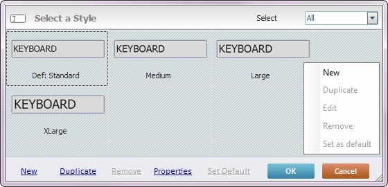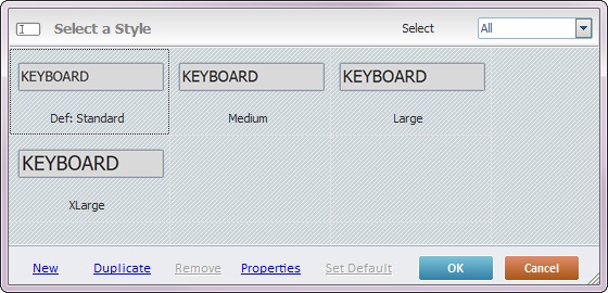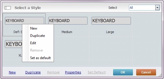 Sets the selected style as the default style ("Def:" is added to the style's designation). Once set, the default style will be adopted by all Input Keyboard controls dragged from the “Control” tab onto the screen. |