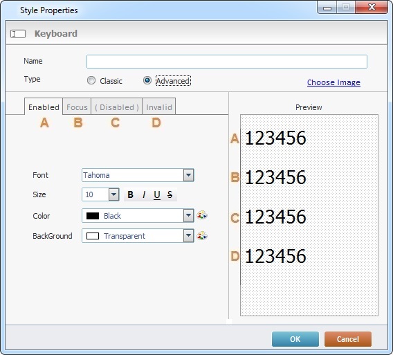 c. Edit each Input Keyboard state (“A- Enabled”; “B-Focus”; “C-Disabled” and “D-Invalid”) after clicking each tab: