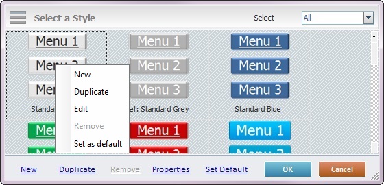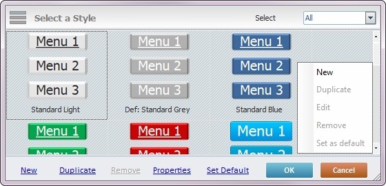 Sets the selected style as the default style ("Def:" is added to the style's designation). Once set, the default style will be adopted by all Menu Button controls dragged from the “Control” tab onto the screen. |
