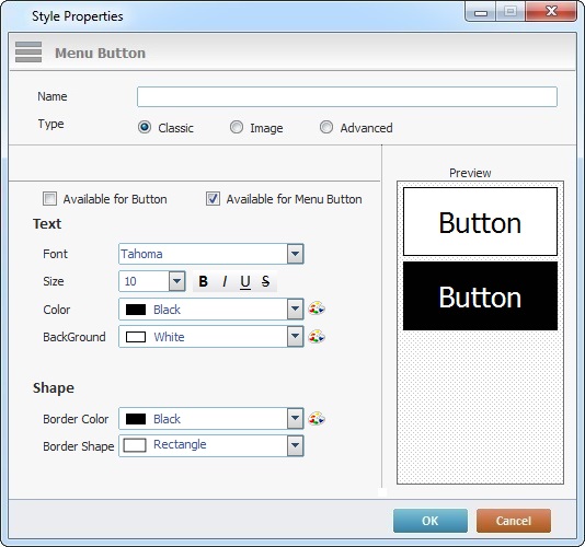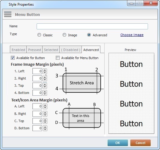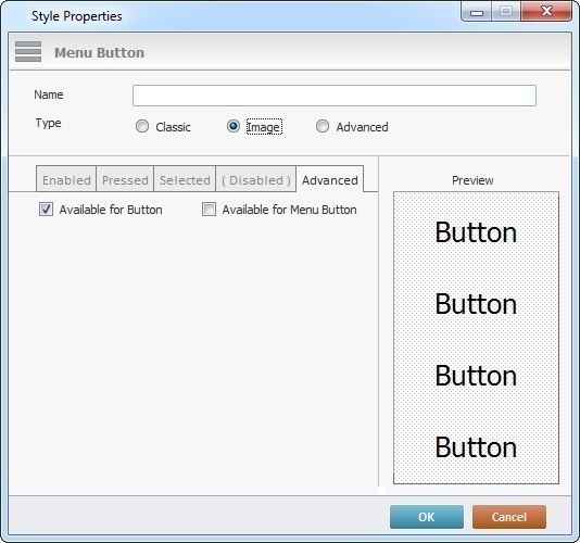 c. The "Advanced" tab allows you to decide if the new style will be available to the Menu Button control and/or the Button control. Check "Available for Button" or "Available for Menu Button" or both.